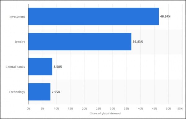 Cena złota, jak każdego innego aktywa, jest określana przez podaż i popyt. Należy jednak zauważyć, że jego wydobycie jest ograniczone, a na popyt na niego w niewielkim stopniu wpływają możliwości przemysłowe (8%) i rezerwy banków centralnych (9%); a przede wszystkim wykorzystanie w jubilerstwie (37%) i jako aktywa inwestycyjne (46%), które uzasadniają 83% jego popytu.