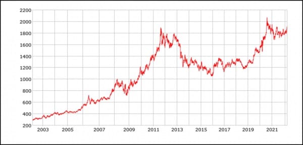 Patrząc na powyższy wykres dotyczący kształtowania się ceny złota, można zidentyfikować bycze okresy zbiegające się z czasami inflacji. Innymi słowy, złoto historycznie rosło w czasach wzrostu cen, kiedy dolar jest słabszy. A gdy inflacja się uspokaja, to i cena złota.